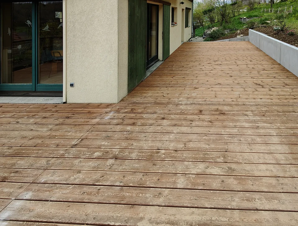 Pour garantir la longévité de votre terrasse, nous préconisons l'utilisation de bois traités. L'intégration d'une inclinaison de 1 à 2 % facilitera l'écoulement des eaux de pluie. Cette conception évite efficacement les accumulations d'humidité qui pourraient fragiliser la structure.